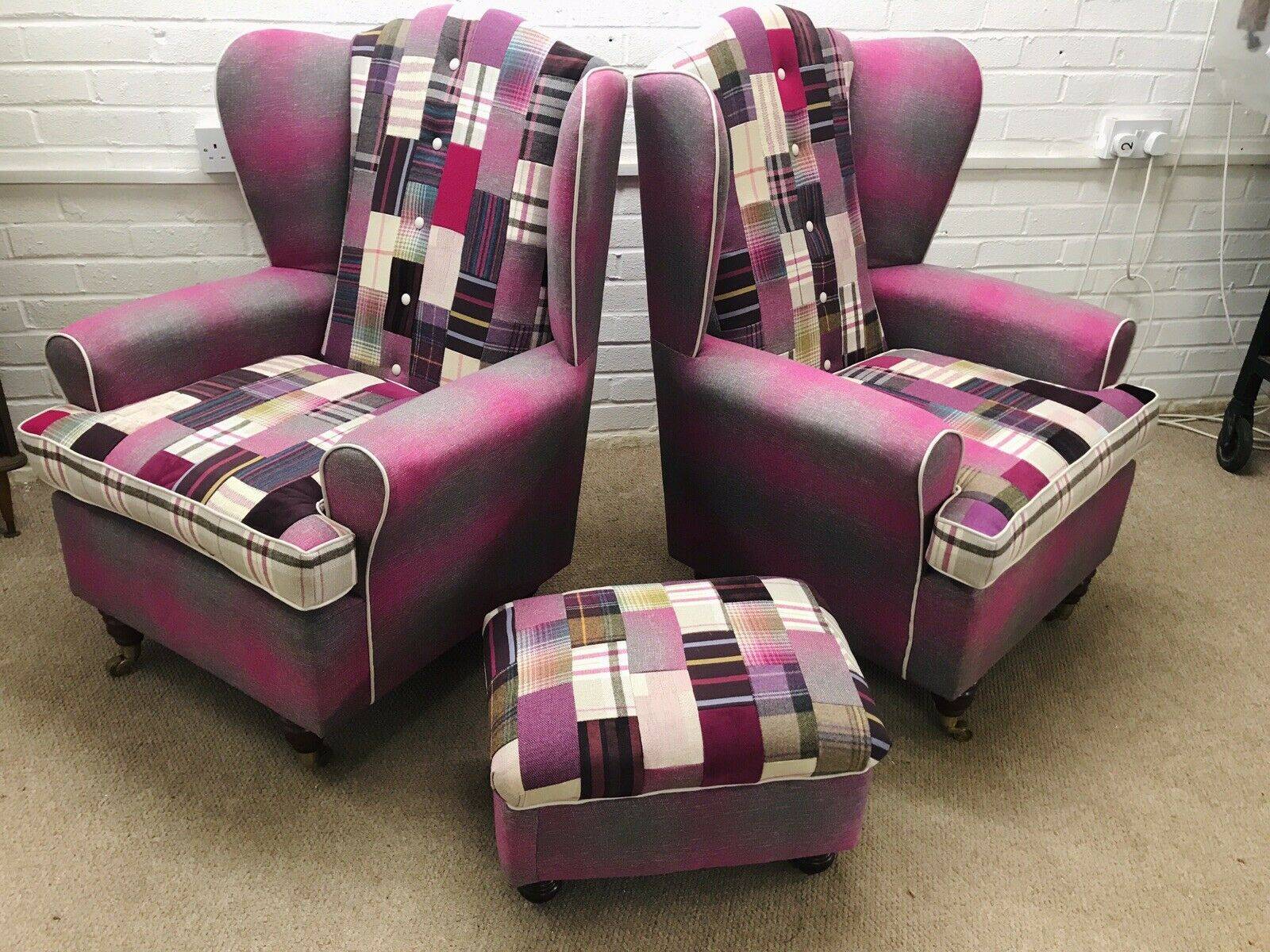 Vintage Hand Made Wing Back Chair & Footstool Upholstered In Patchwork Design