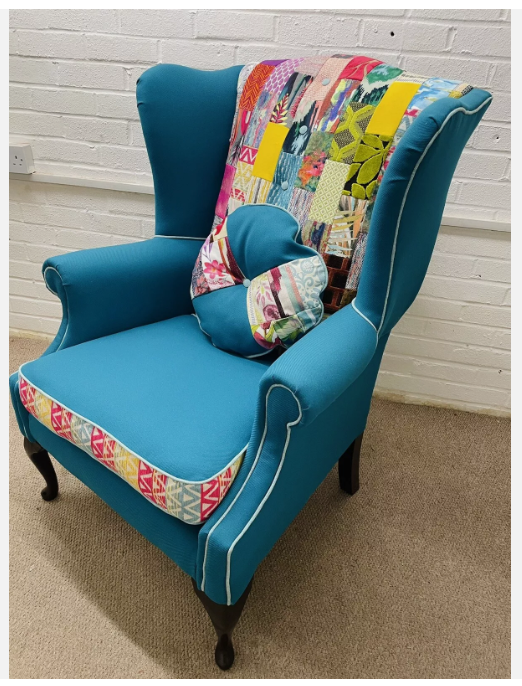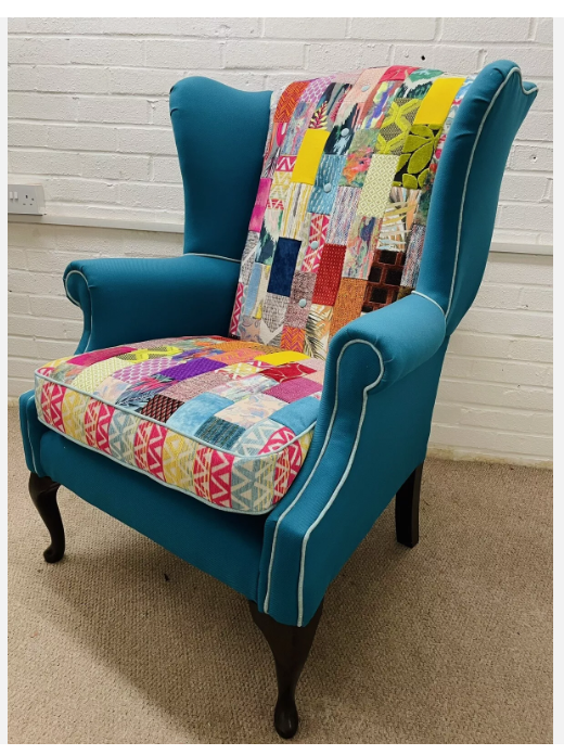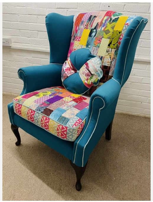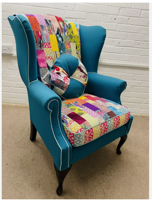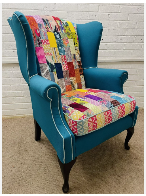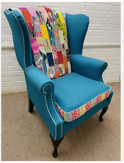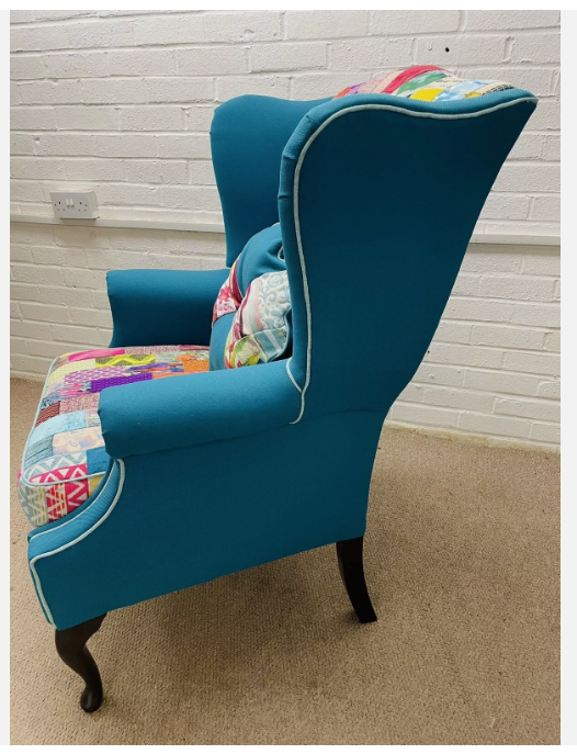 Hilton Hotel wing back chair re-upholstered in bright colours patchwork design and teal colour fabric Seat cushion reversible, free decorative cushion.