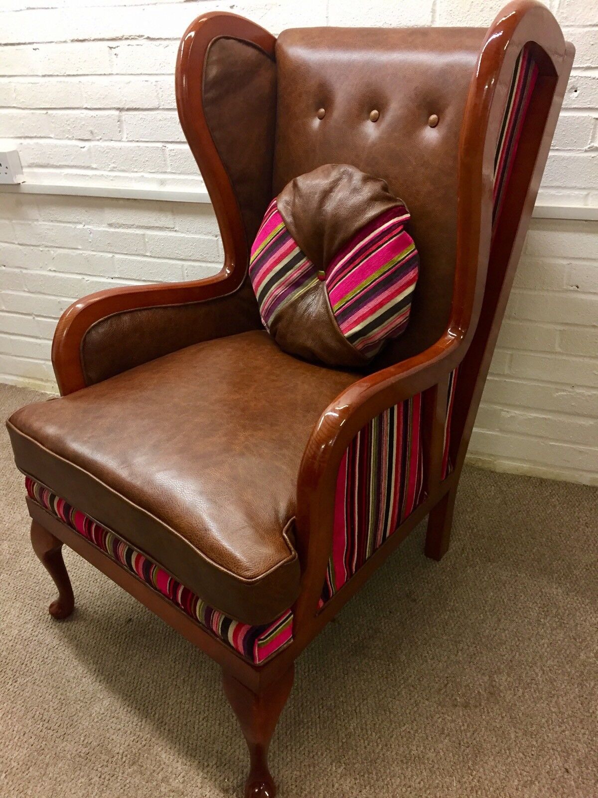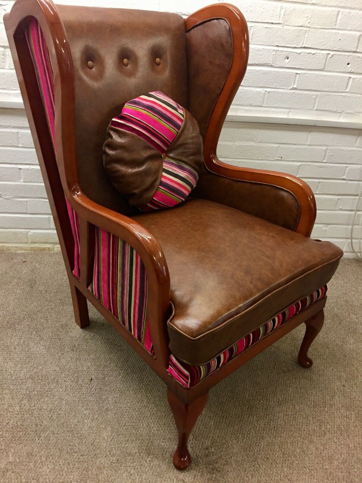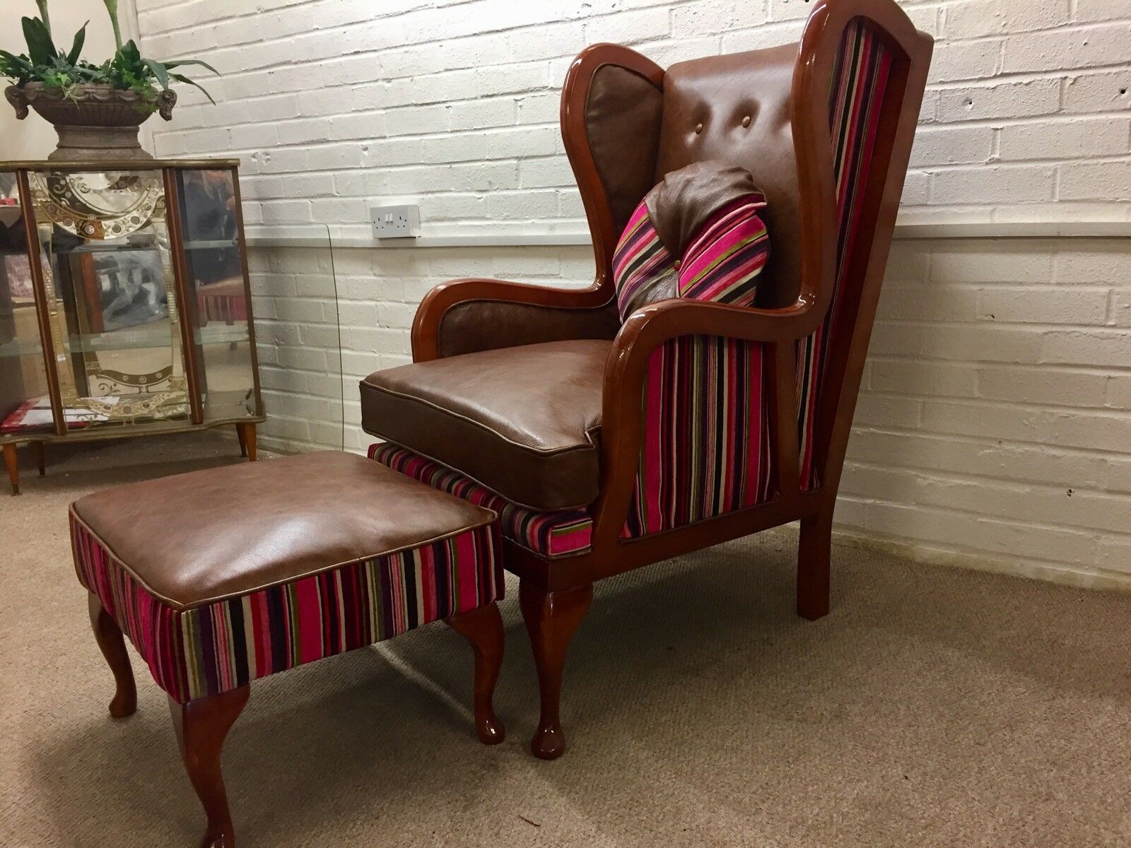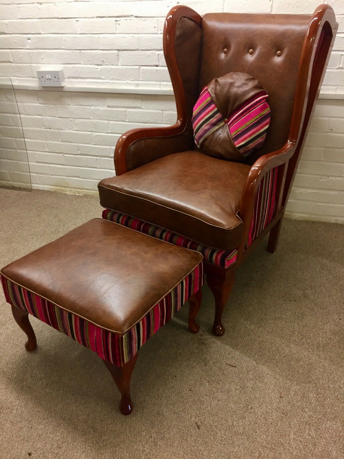 Hand made in England. Wing Back Chair and Footstool, professionally upholstered in genuine Italian leather and Designers Guild Velvet, free decorative cushion. Seats cushion reversible. Hard Solid wood frames.