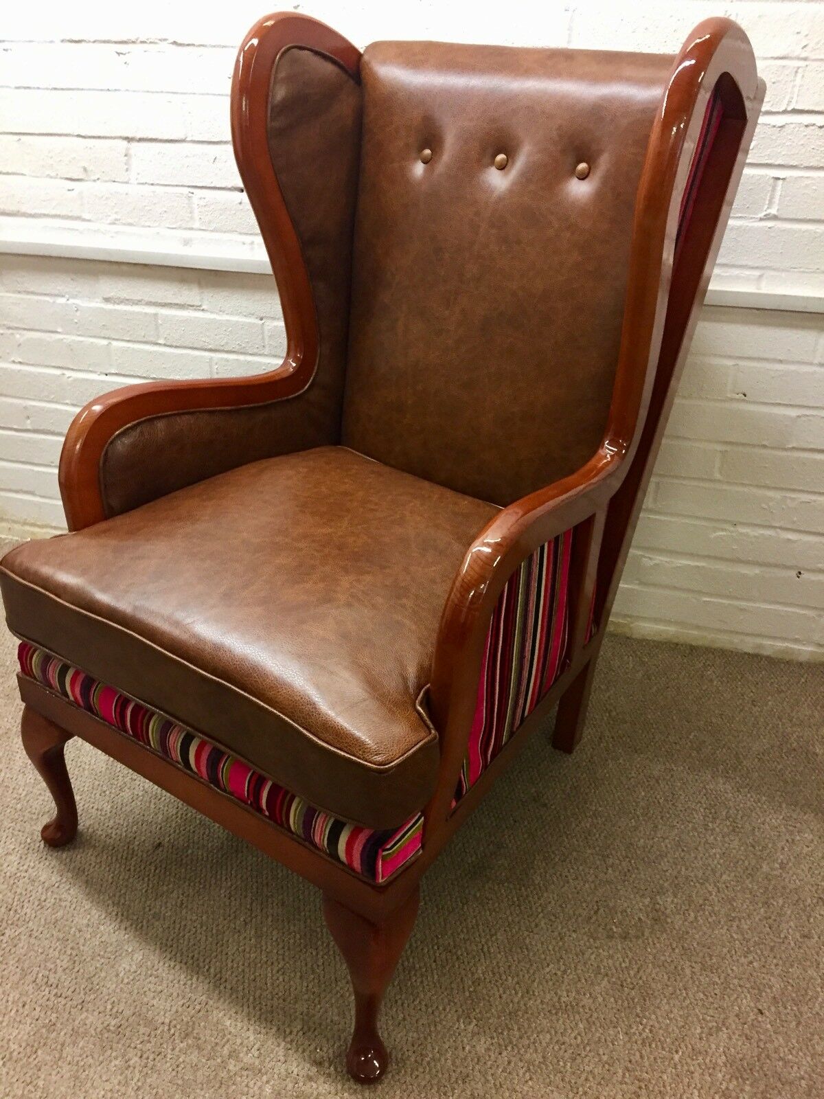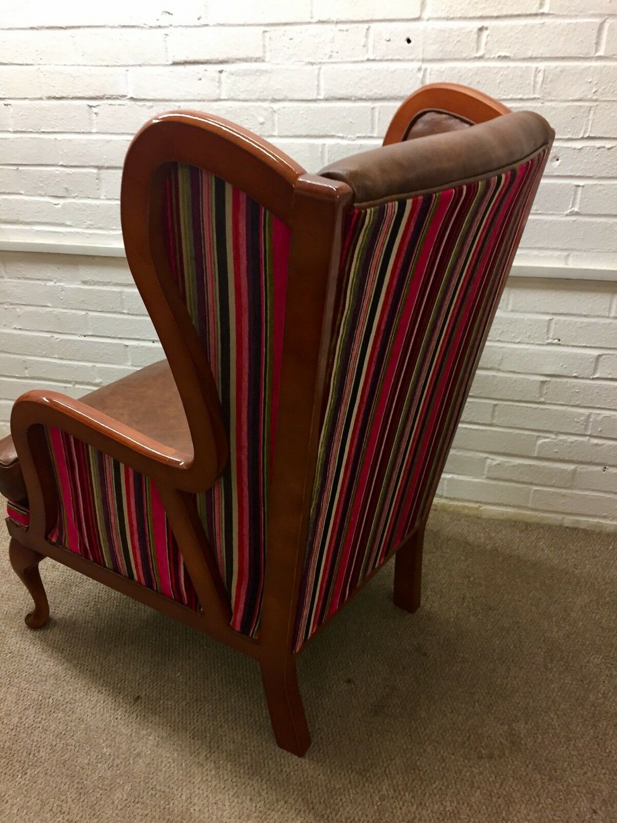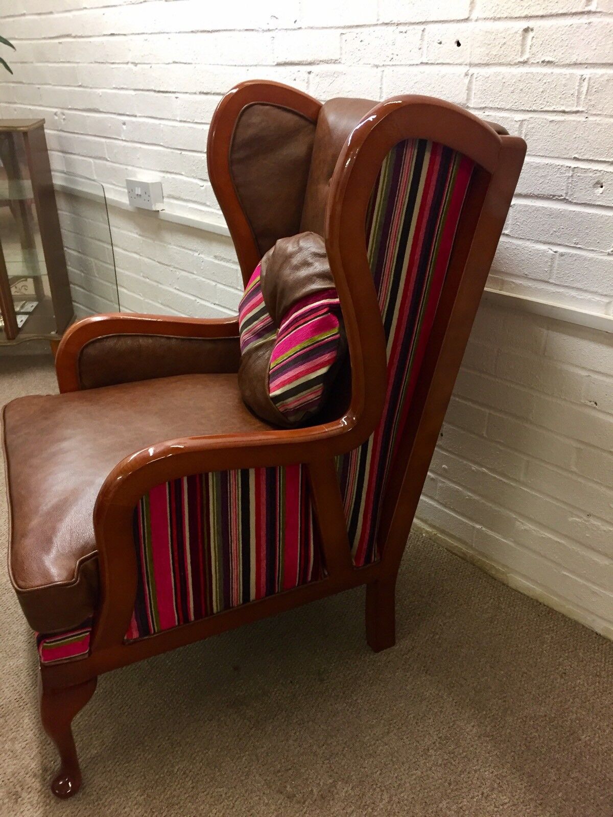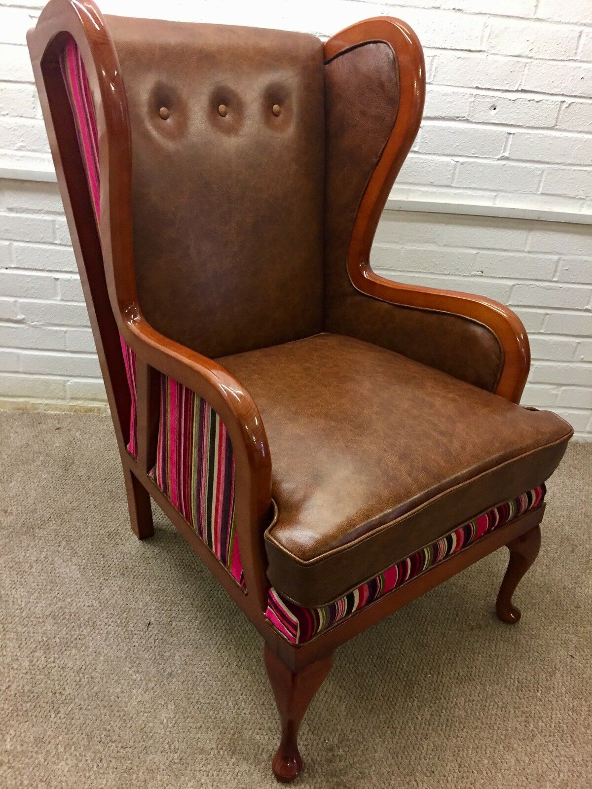 Hand made in England. Wing Back Chair and Footstool, professionally upholstered in genuine Italian leather and Designers Guild Velvet, free decorative cushion. Seats cushion reversible. Hard Solid wood frames.