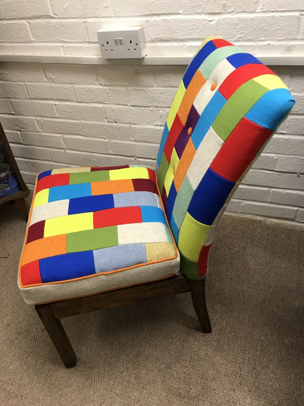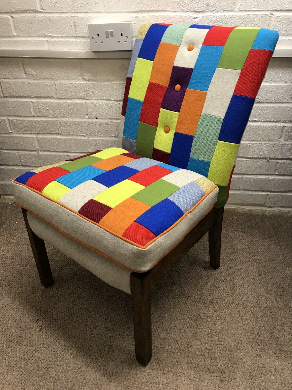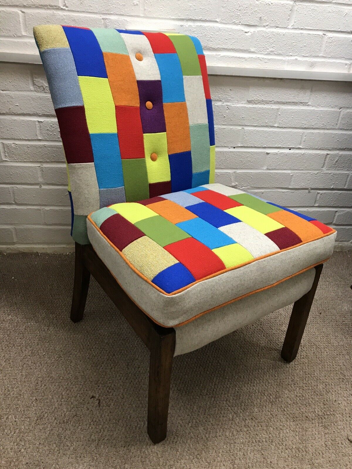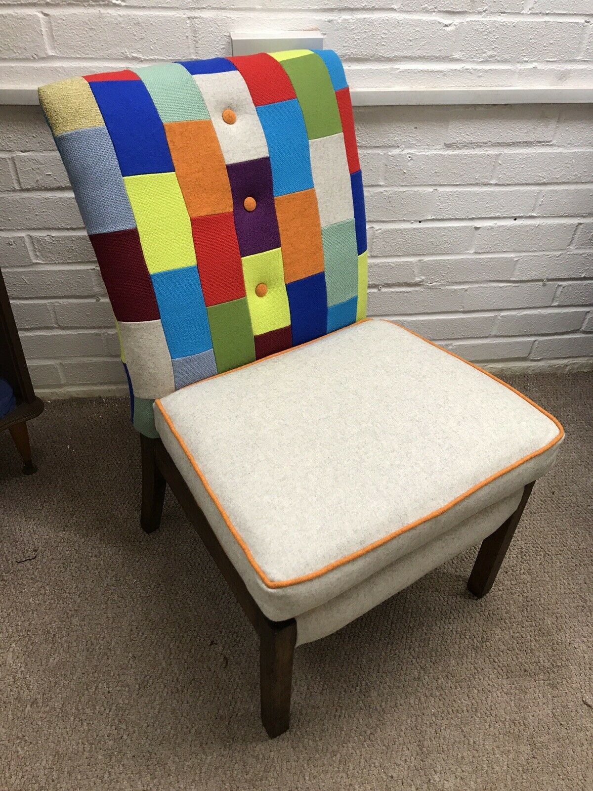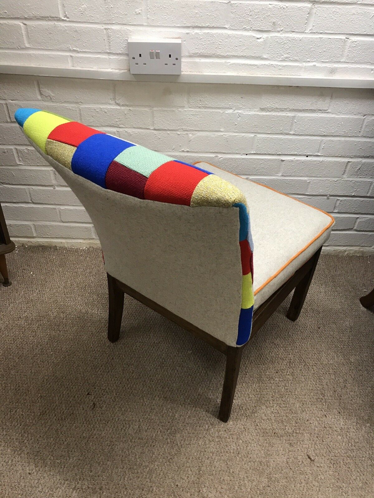 Hand made vintage bedroom chair newly upholstered in New Zealand wool and patchwork design. Seat cushion reversible