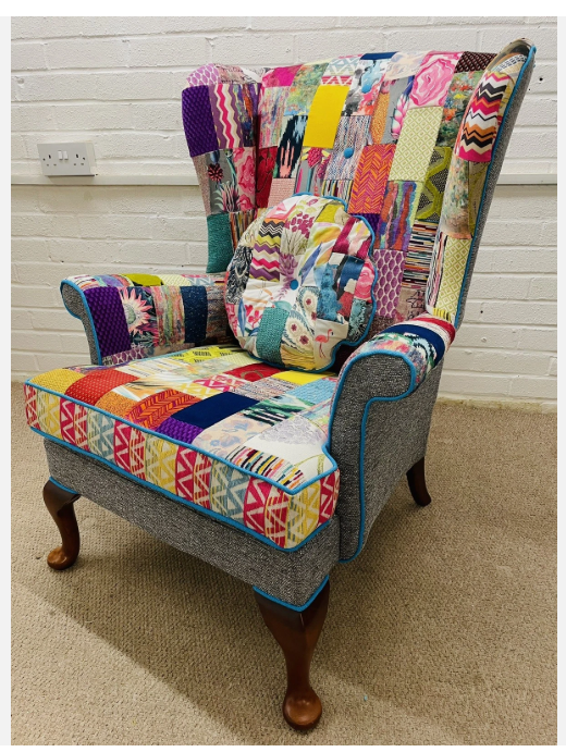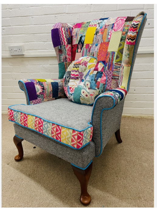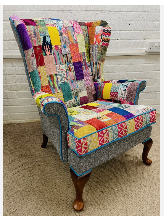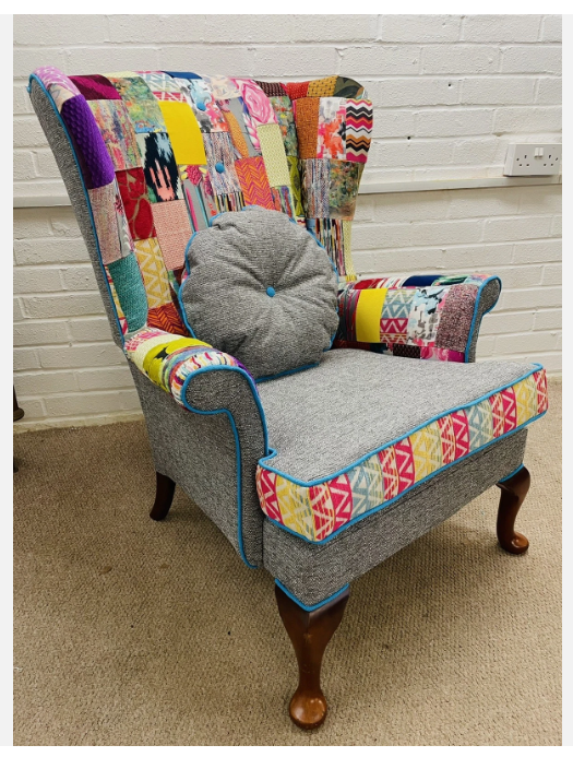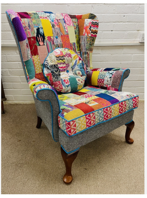 Parker Knoll wing Back chair reupholstered in bright colours patchwork design and Grey woven fabric. Seat cushion reversible, free decorative cushion. Solid wood  frames are in excellent condition, new firm foam seat cushion. Chair 100 % hand crafted in England